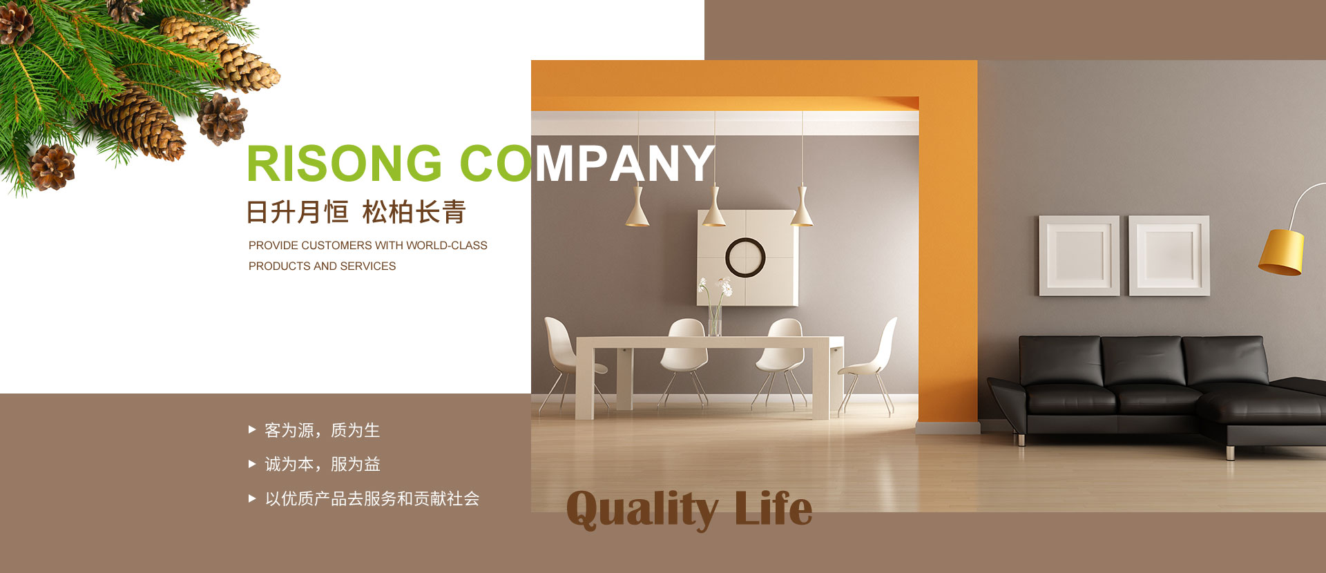 大連日松將一直秉承“以優(yōu)質產(chǎn)品去服務和貢獻社會”的經(jīng)營宗旨;“客為源,質為生、誠為本、服為益”的經(jīng)營理念;達到“使用者、銷售者、制造者”三者并存共榮之經(jīng)營思路;全體日松人將以“熱情、禮貌、快捷、準確”的行動指南,不懈努力的為每一位客戶,提供行業(yè)內一流的高端、環(huán)保、舒適、健康的產(chǎn)品和細節(jié)服務,打造出適合“您”的優(yōu)質家居住宅環(huán)境。